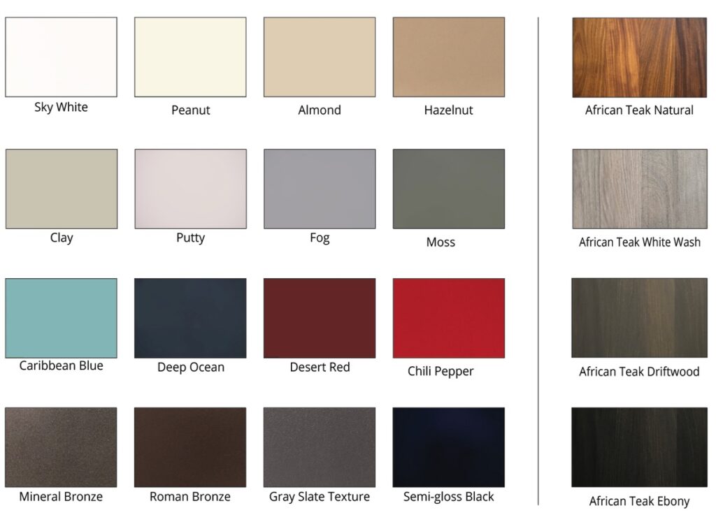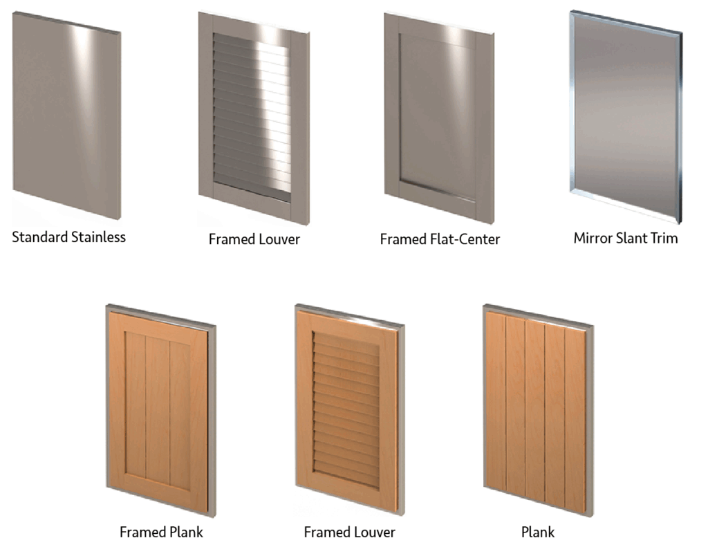 Stainless Steel doors are available with either a Brushed or Powder Coat finish. Our wood doors, which are inserted into a metal frame, are available in African Teak in a choice of colors. Metal frame finish options on the wood doors are Brushed Stainless or Powdercoat.