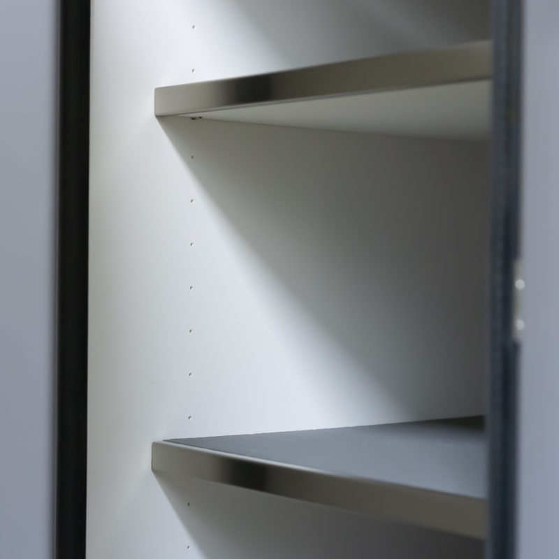 Our adjustable shelves are 3/4″ thick with a 3mm support pin. Shelves are notched to keep the shelf from moving forward on the pin. Shelf material is the same as the cabinet case material. All shelves have a stainless steel front edge, which adds not only a beautiful aesthetic but durability as well. A non-skid liner is included on all shelves and cabinet floors.