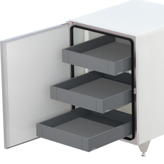 Roll-out shelves consist of a powder-coated metal drawer box on full extension, soft-close, under mount drawer track. The drawer bottom and back is 5/8″ thick gray, polyethylene. Roll-out shelves are available in shallow and deep heights.